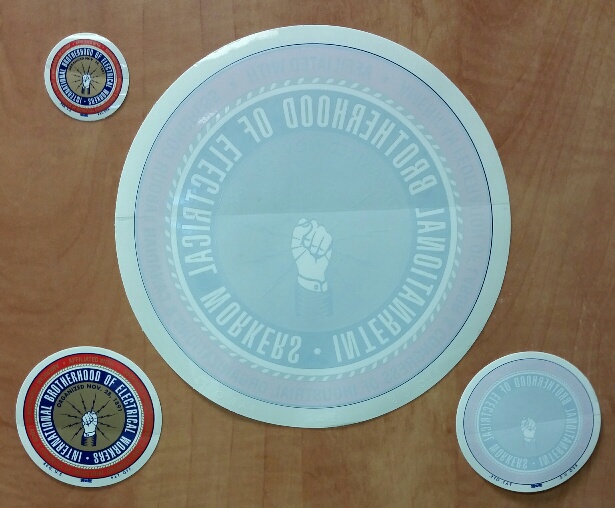 I.B.E.W. decals 8" window decal is $0.50 1 1/2" decal, 3" decal and 3" window decal also available at The Hall |